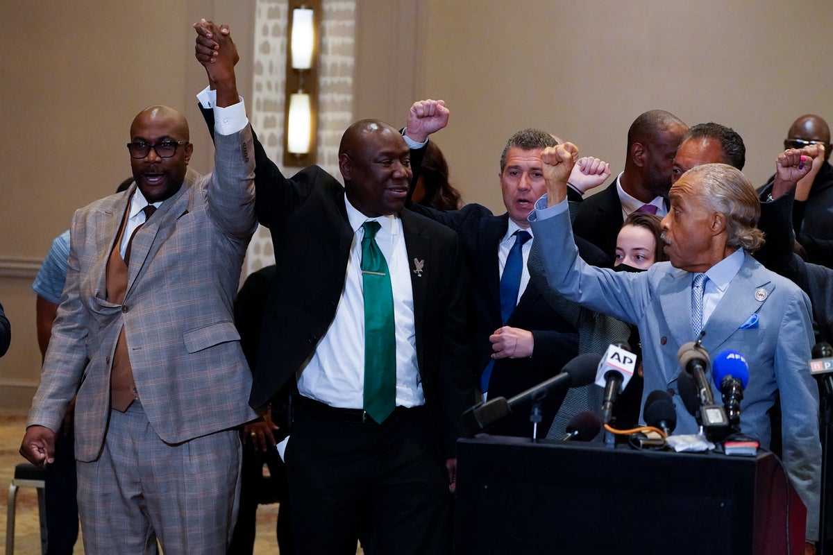 Philonise Floyd, Attorney Ben Crump and the Rev, Al Sharpton, from left, react after a guilty verdict was announced at the trial of former Minneapolis police Officer Derek Chauvin for the 2020 death of George Floyd, Tuesday, April 20, 2021, in Minneapolis, Minn. Former Minneapolis police Officer Derek Chauvin has been convicted of murder and manslaughter in the death of Floyd. (AP Photo/Julio Cortez)