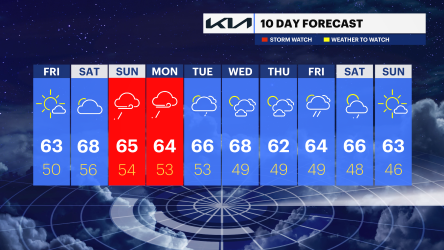 MONDAY: STORM WATCH - Cloudy with periods of lingering rain, coastal flooding and wind. Highs around 64 degrees. Lows near 53 degrees.