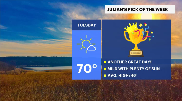 TUESDAY: PICK OF THE WEEK - Lots of sunshine with temperatures typical for mid-May. Highs: Upper 60s to low 70s. Lows: Upper 40s.
