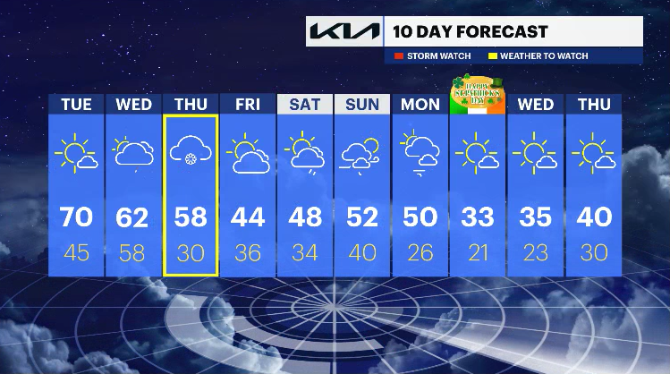 WEDNESDAY: Mostly cloudy with cooler temps moving in through the day. Highs: Upper 50s to low 60s. Lows: Upper 50s.