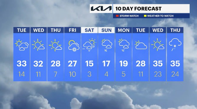 WEDNESDAY: Mostly sunny to mostly cloudy late in the day. Highs: Upper 20s to low 30s. Lows: Upper single digits to low teens.