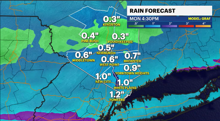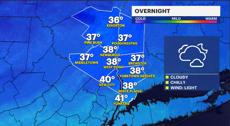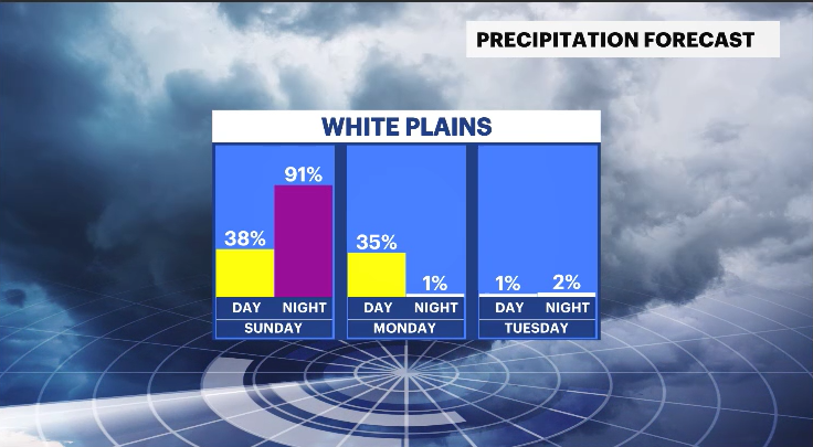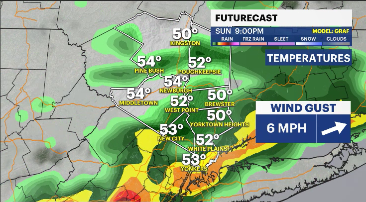 Sunday is mostly cloudy, but a touch warmer with highs in the upper 50s. Showers are possible late in the morning and afternoon in the upper Hudson Valley. However, heavy rain is likely to move in across the rest of the region Sunday evening after 7 p.m.