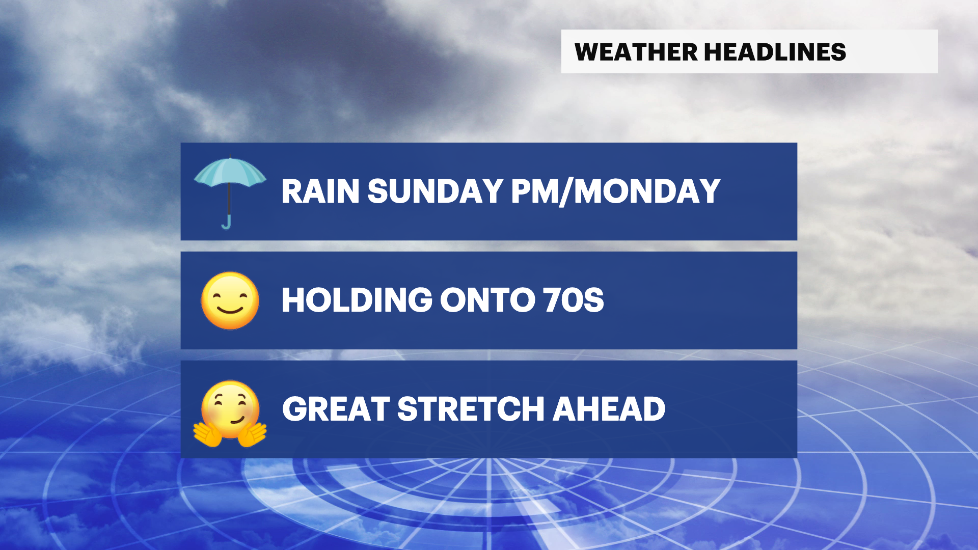 SUNDAY: Sunshine early with clouds increasing in the afternoon and scattered showers likely in the evening hours. High temperatures in the upper-70s.