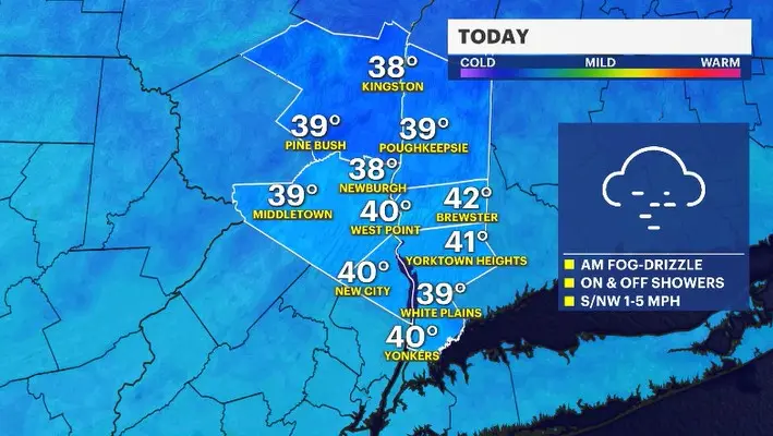 Gloomy conditions are expected today, with scattered showers & patchy fog