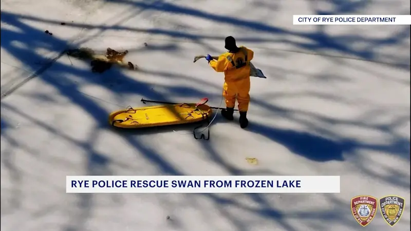 Police, firefighters free swan trapped in ice on Rye pond