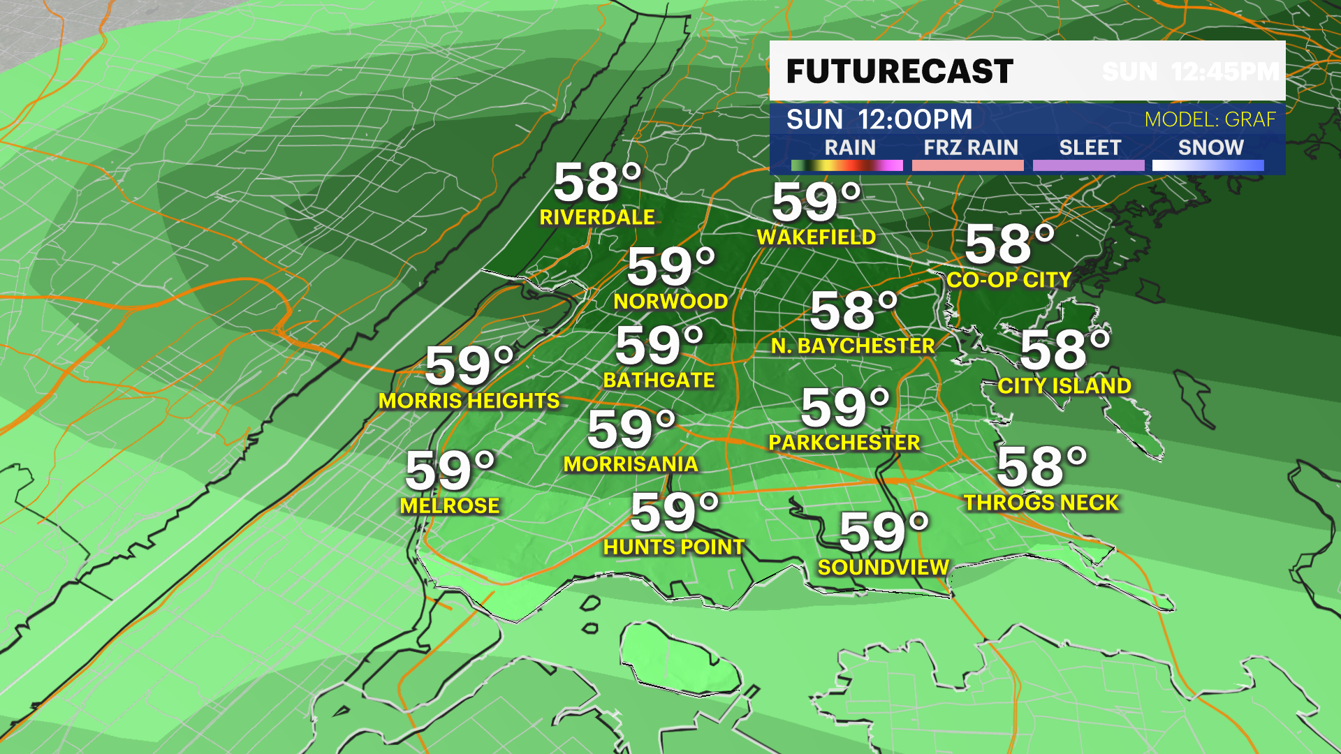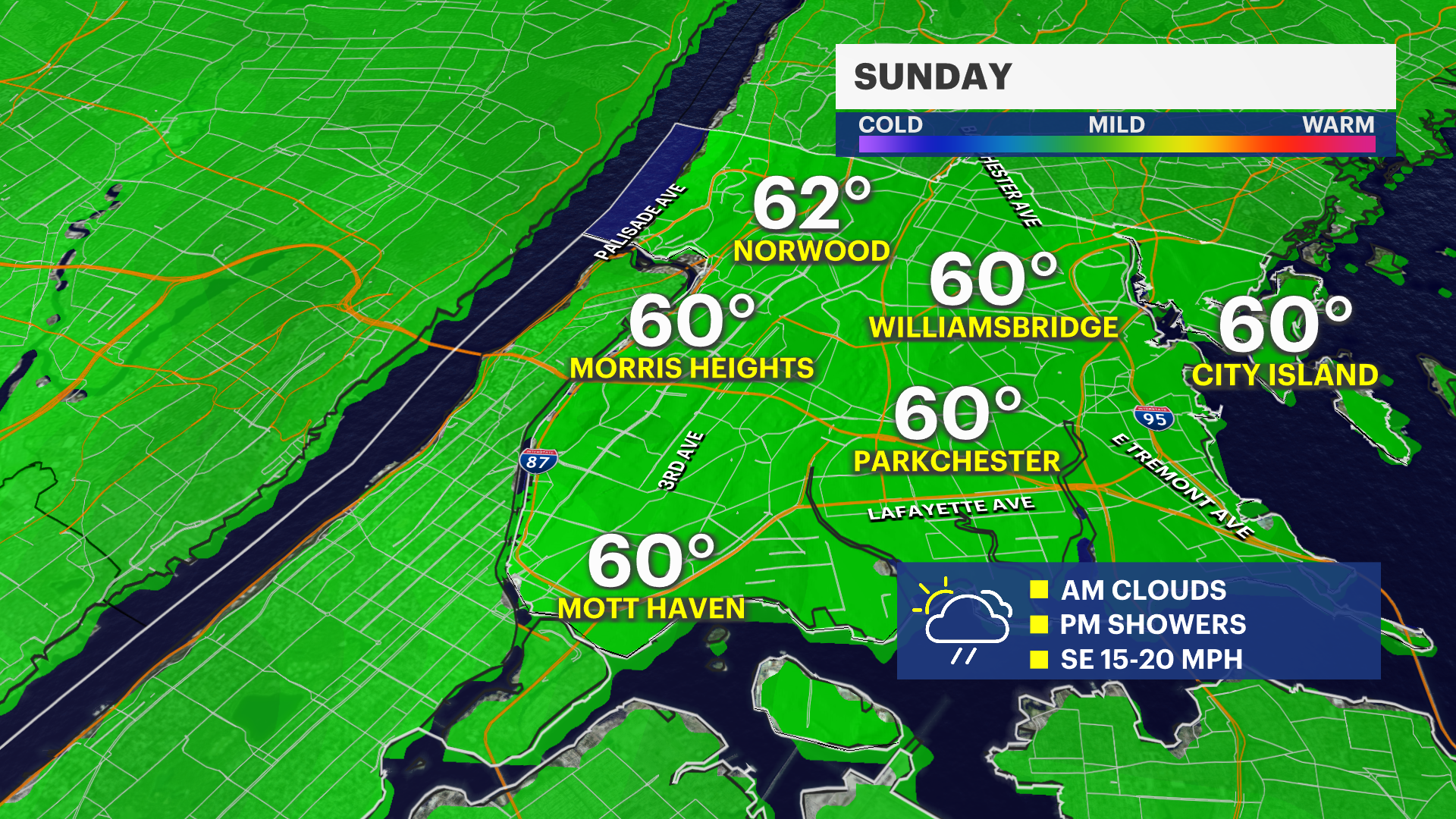 SUNDAY: Mostly cloudy, with showers arriving in the afternoon. High of 60.