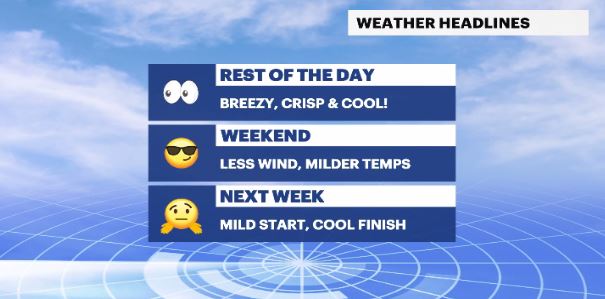 WHAT'S NEW: The cold front from yesterday has come and gone, but left a breezy wind and a chill in the air in it’s wake. This will continue through the rest of the day and into the first half of Saturday