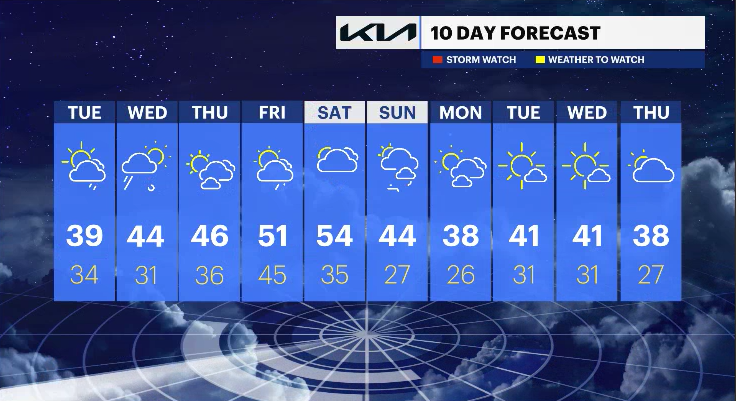 Wednesday: Any rain will end early in the morning. Expect it to be milder with a mix of sunshine and clouds. Wind gusts will pick up near 30 mph. Highs in the 40s. Lows in the 30s.
