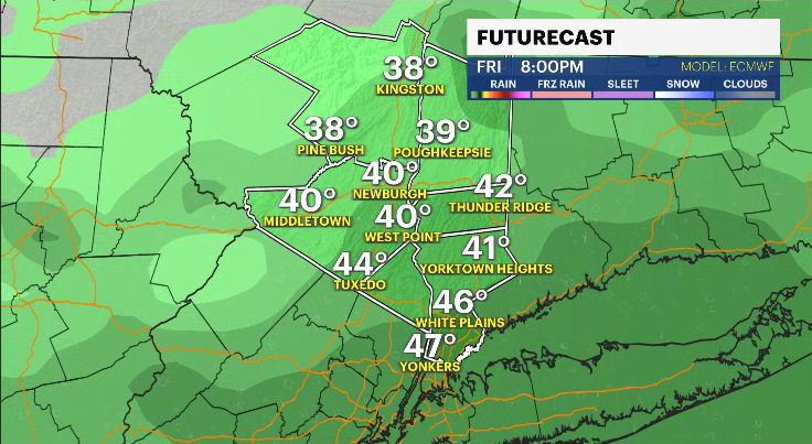 Friday: Mostly cloudy in the evening, very mild, and rain likely at night. There will be breezy periods as well, wind gusts from 20-30 mph. Highs in the low 50s. Lows in the mid-40s.