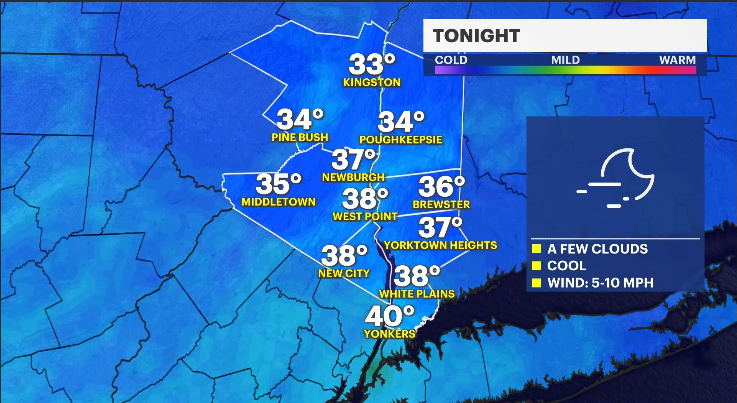 Cloudy skies return for Wednesday, with rain on Thursday. Temperatures will remain mild through Thursday morning, then a cold wind will knock temperatures into the 30s and 40s for Friday.