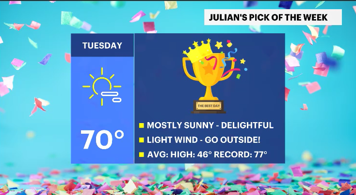 Tuesday's forecasted warmth and sunshine make it the pick of the week. Even though temperatures are expected to be shy of the record, 70s for this time of year are immaculate.