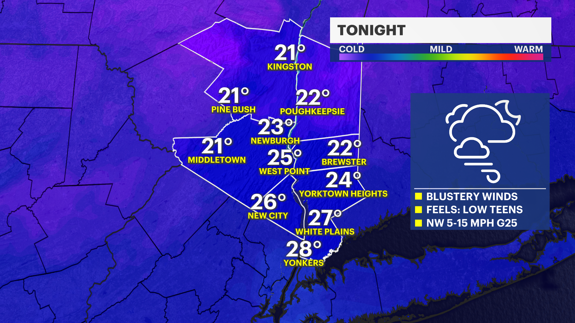 TONIGHT: Winds linger as temperatures take a dip under partly cloudy skies. Lows: 20s.