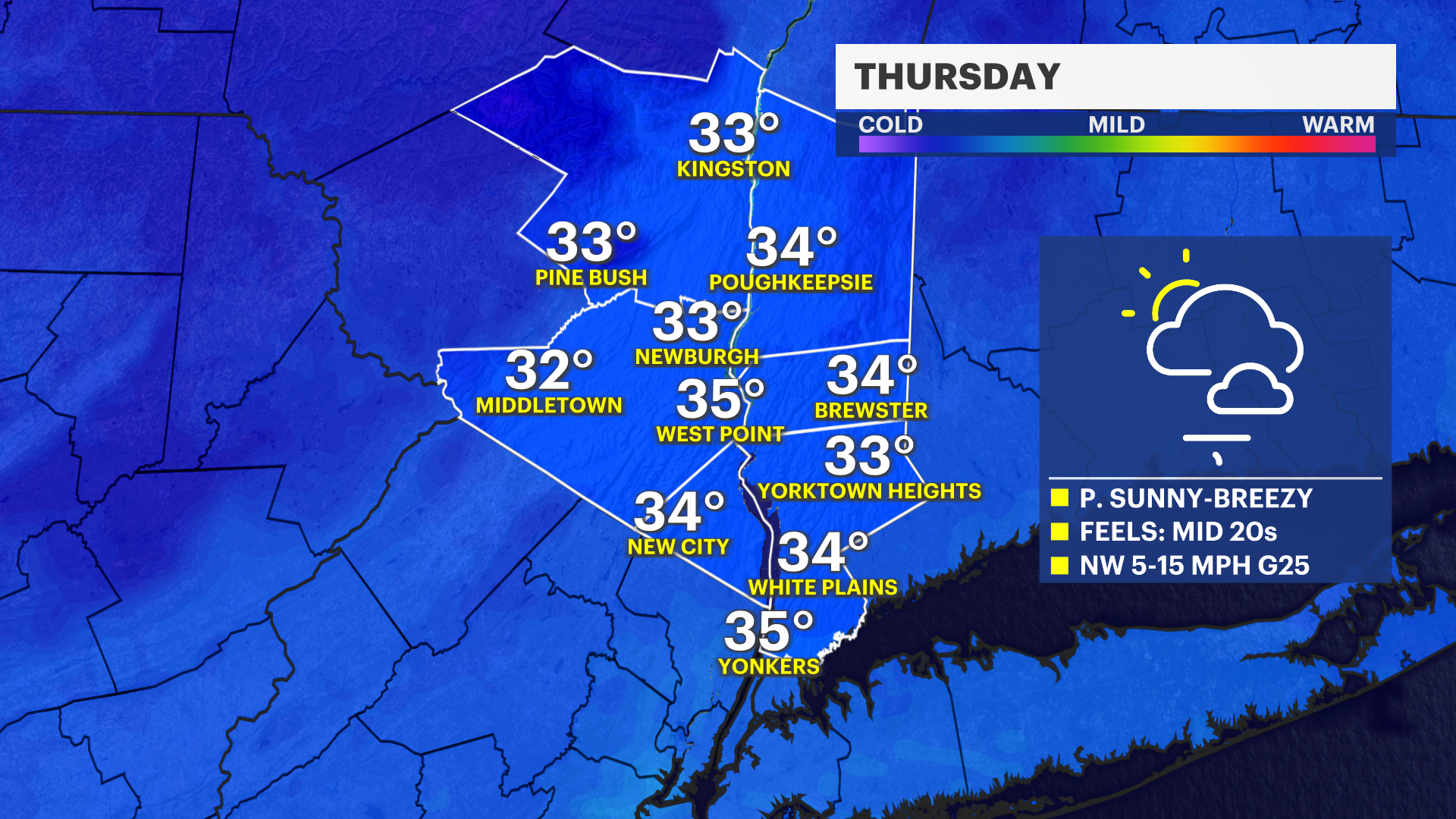 THURSDAY: Partly cloudy and breezy through much of the day. Highs: Mid-30s. Lows: Upper teens.