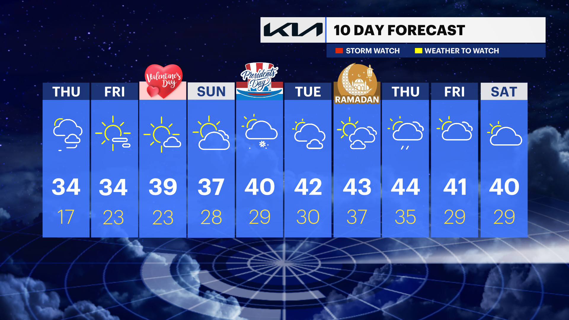 Sunday into Presidents' Day is when a round of mixed wintry showers will be possible. Valentine's Day is on Saturday, and it will be a dry one with a lovely chill in the air.