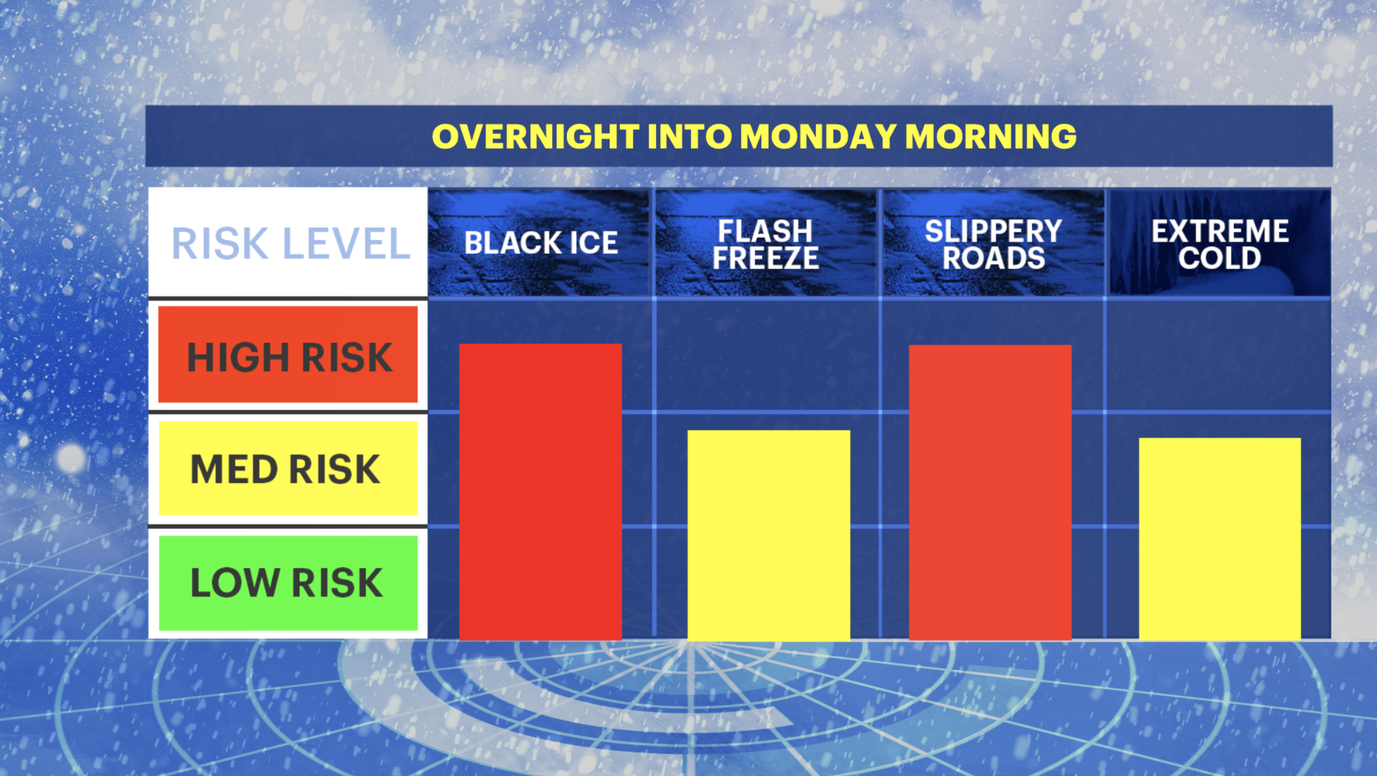 We expect lows in the teens and single digits by early Monday. Those extremely cold temperatures will bring a risk of black ice, flash freezing and slippery surfaces.