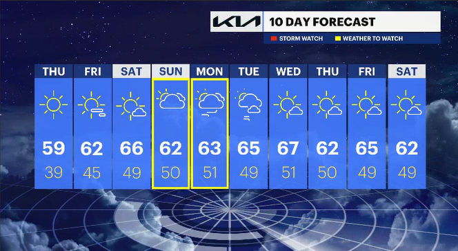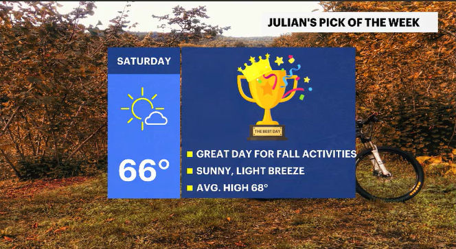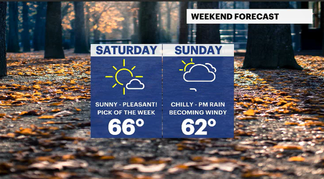 SATURDAY (PICK OF THE WEEK): Mostly sunny, cool, and pleasant day. Highs in the mid-60s. Lows upper 40s.