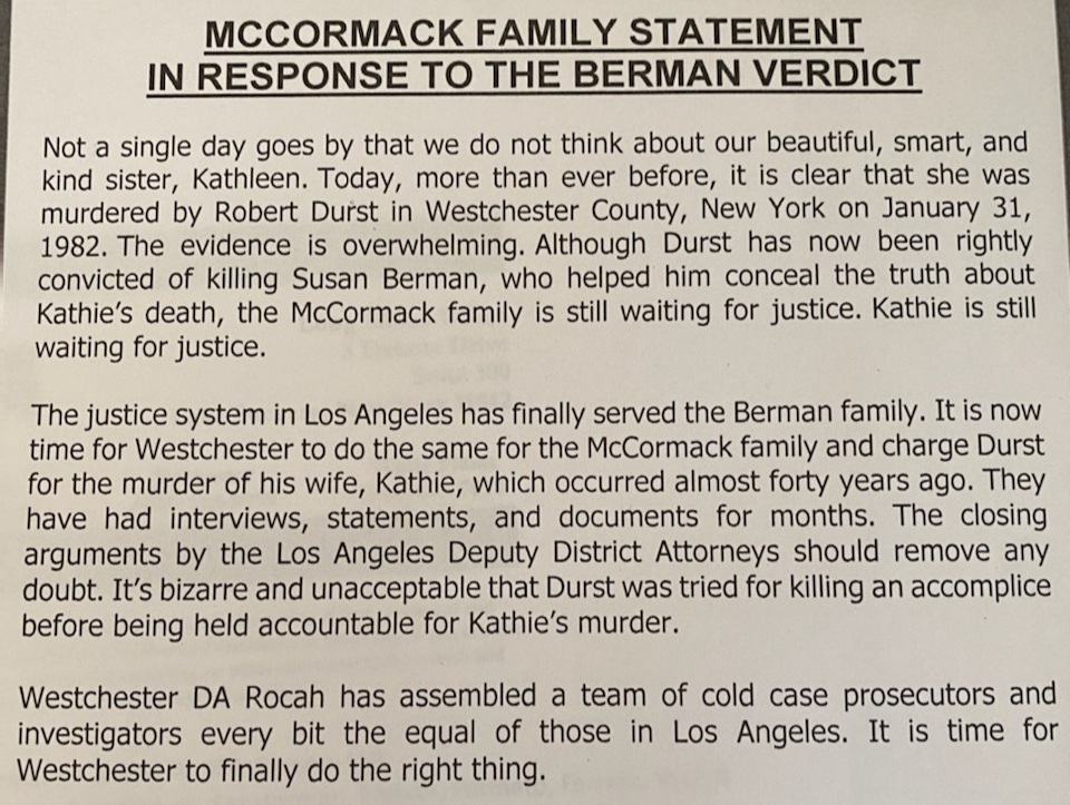 The attorney of Kathie's family sent News 12 a statement that says in part, "Not a single day goes by that we do not think about our beautiful, smart and kind sister Kathleen. Today, more than ever before, it is clear that she was murdered by Robert Durst in Westchester County. The justice system in Los Angeles has finally served the Berman family. It is now time for Westchester to do the same for the McCormack family and charge Durst for the murder of his wife, Kathie, which occurred almost forty years ago."
