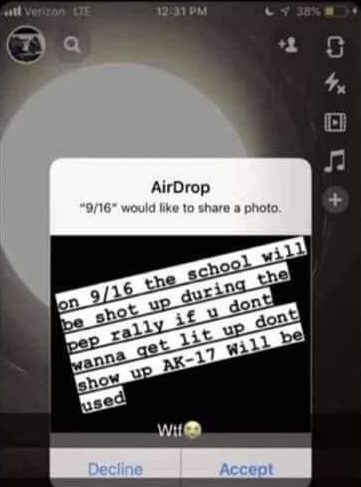 The next day, an AirDrop message was circulated between students at lunch, saying someone was going to shoot up Friday’s pep rally with an assault rifle.