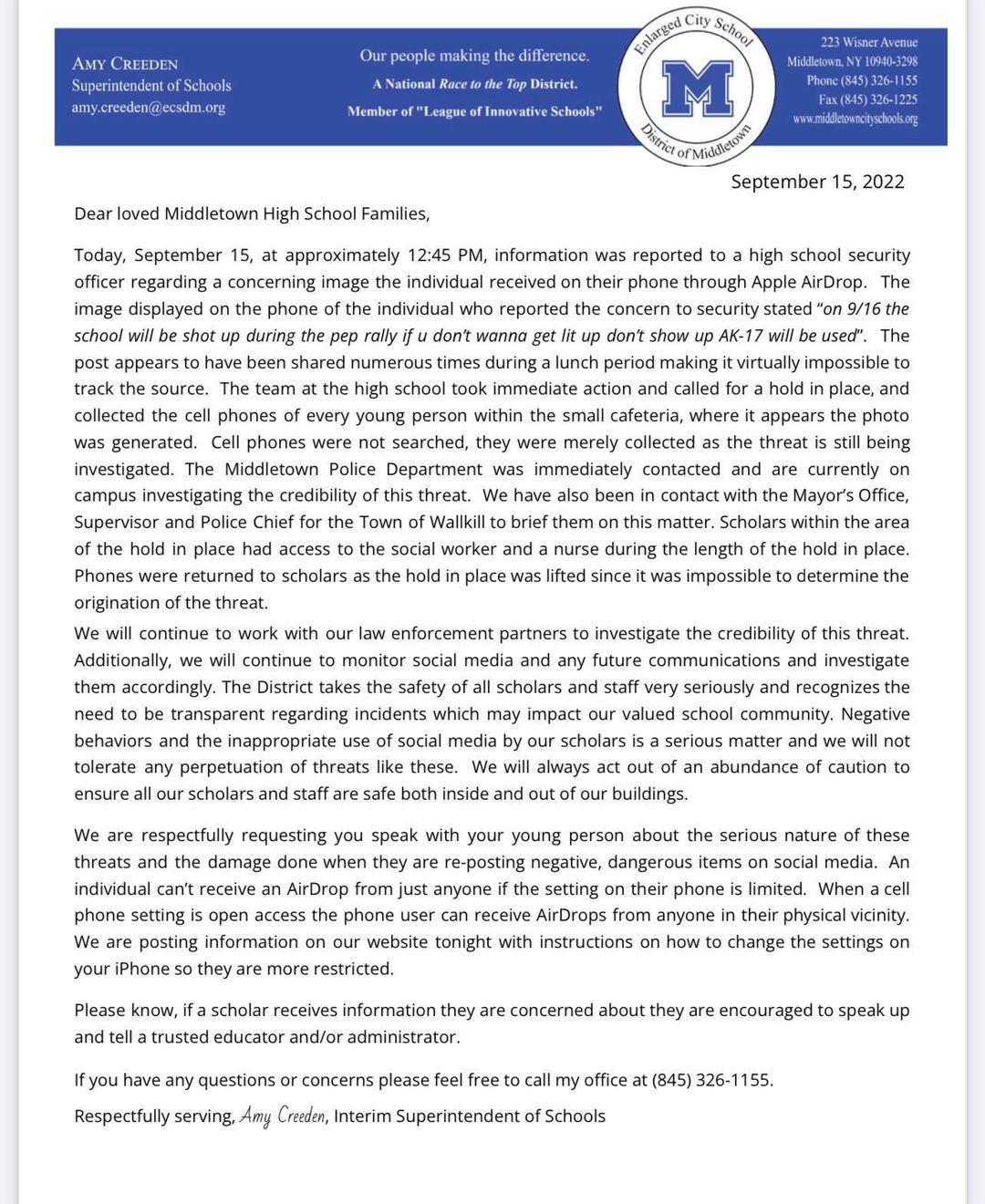 The Middletown school district released a statement saying any students that missed school Friday, following the shooting threat, would not be marked absent.