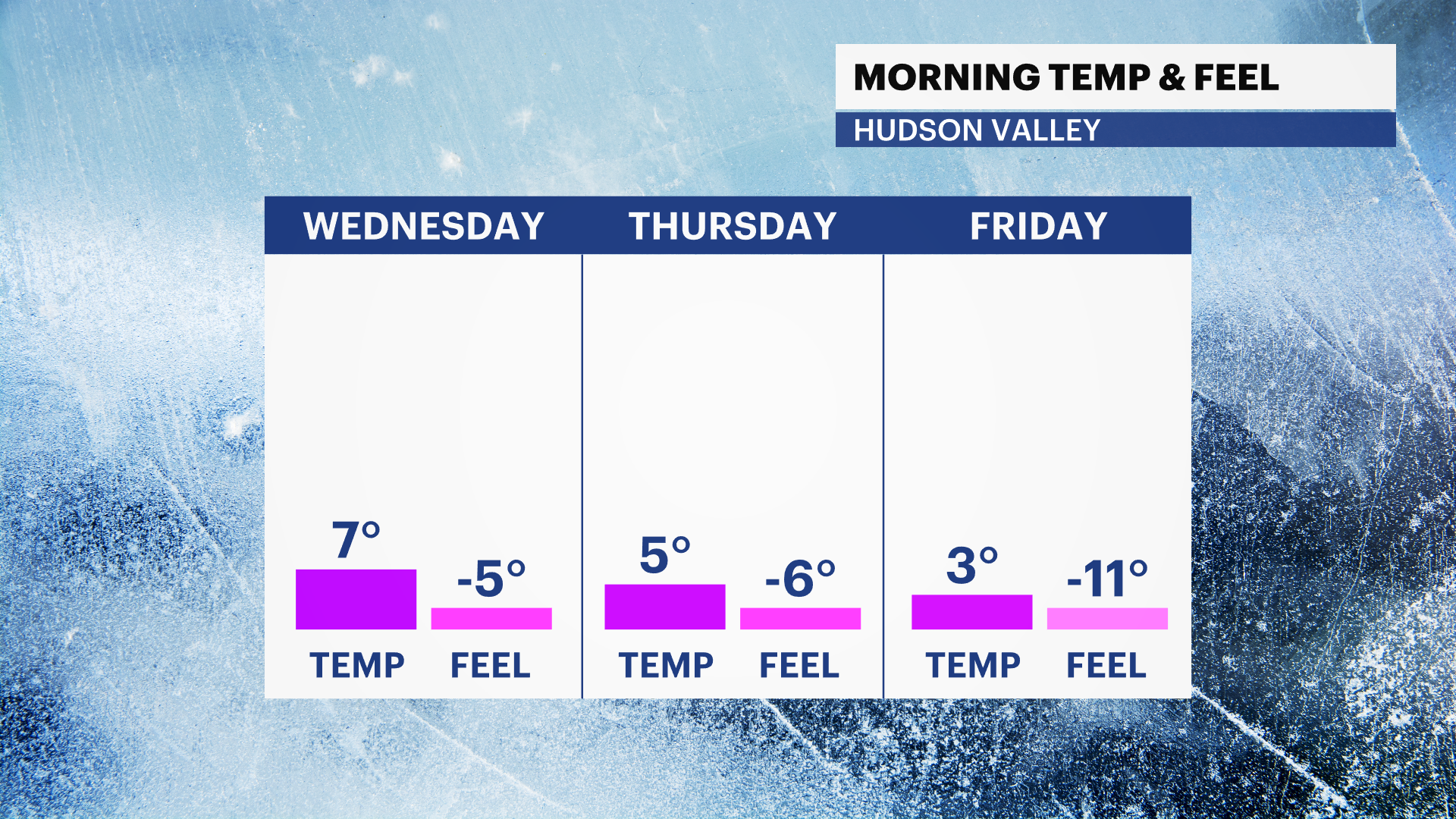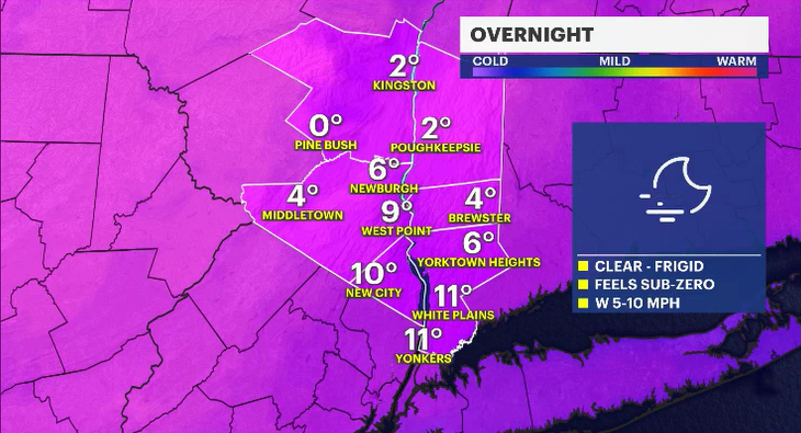 Overnight: Clear skies, frigid, and feels sub-zero. Low temperatures will range from single digits to low teens.