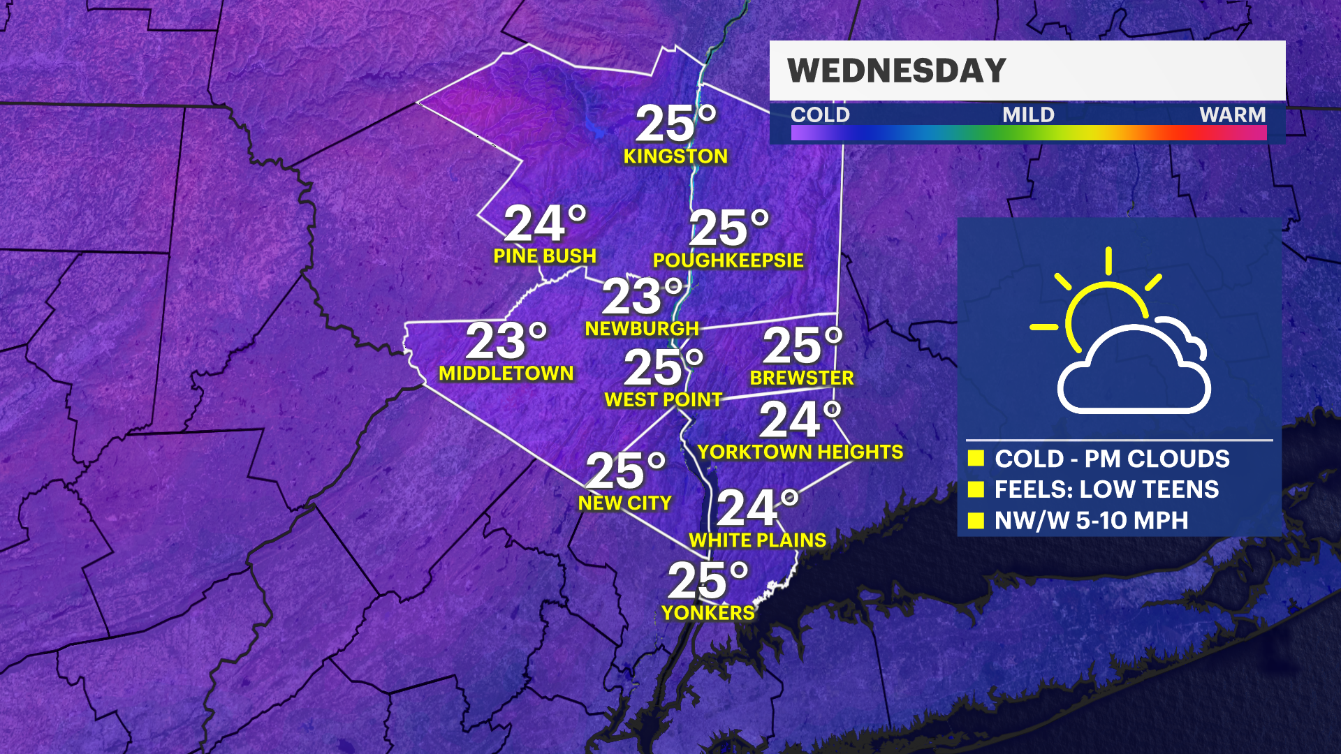 Wednesday: Sunny start to the day with clouds in the afternoon. It will be frigid, but not as breezy. High temperatures will be from the teens to 20 degrees. Wind chill values range from 0 to -10 degrees in the morning, and single digits during the day. Low temperatures: in the single digits.