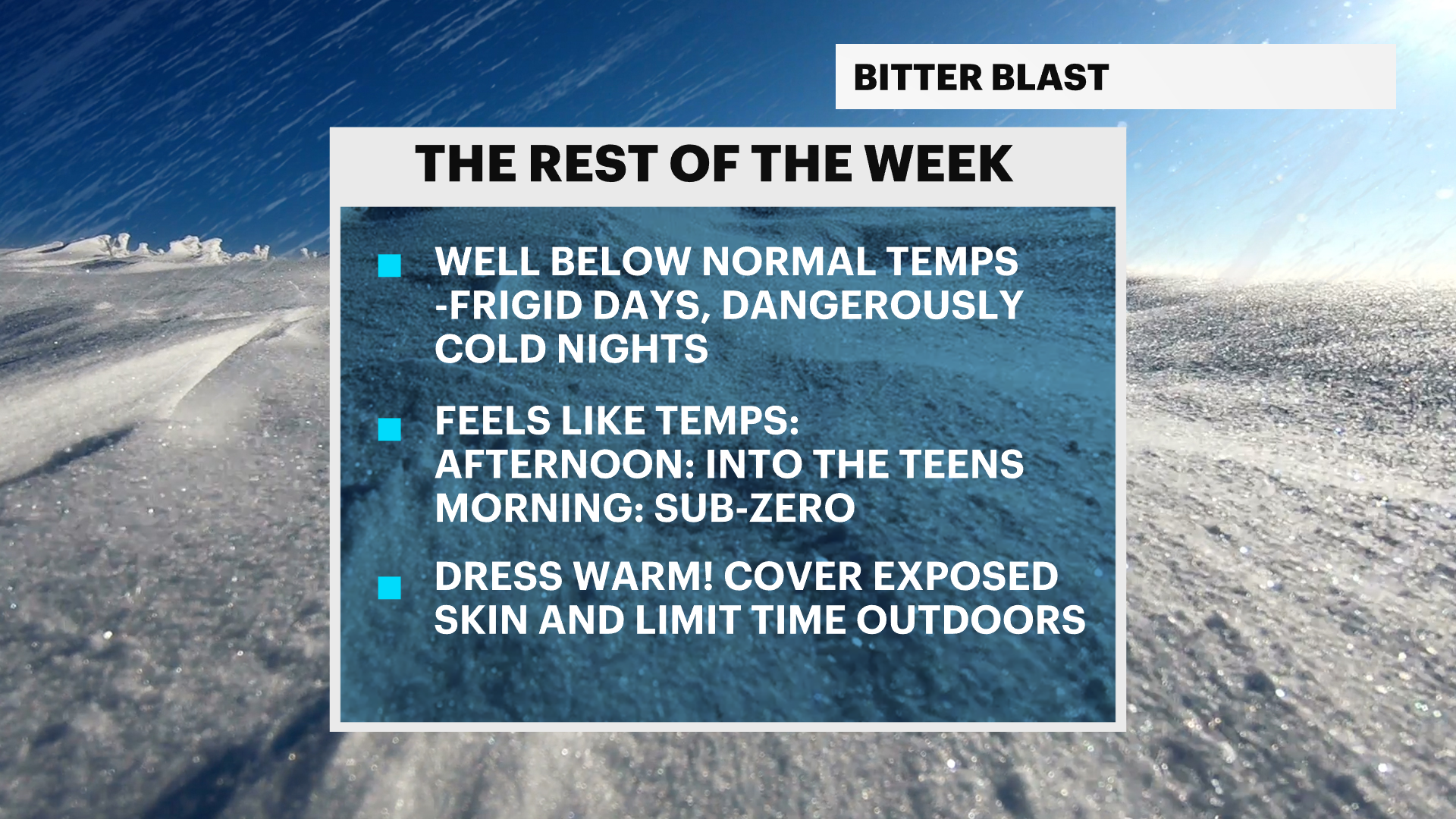 The bitter and extreme cold continues this week for the region. Temperatures will remain well below normal through the weekend. Temperatures will not even be above freezing at least until mid-next week. Daytime temperatures may rise into the 20s, but wind chills will stay in the low teens.