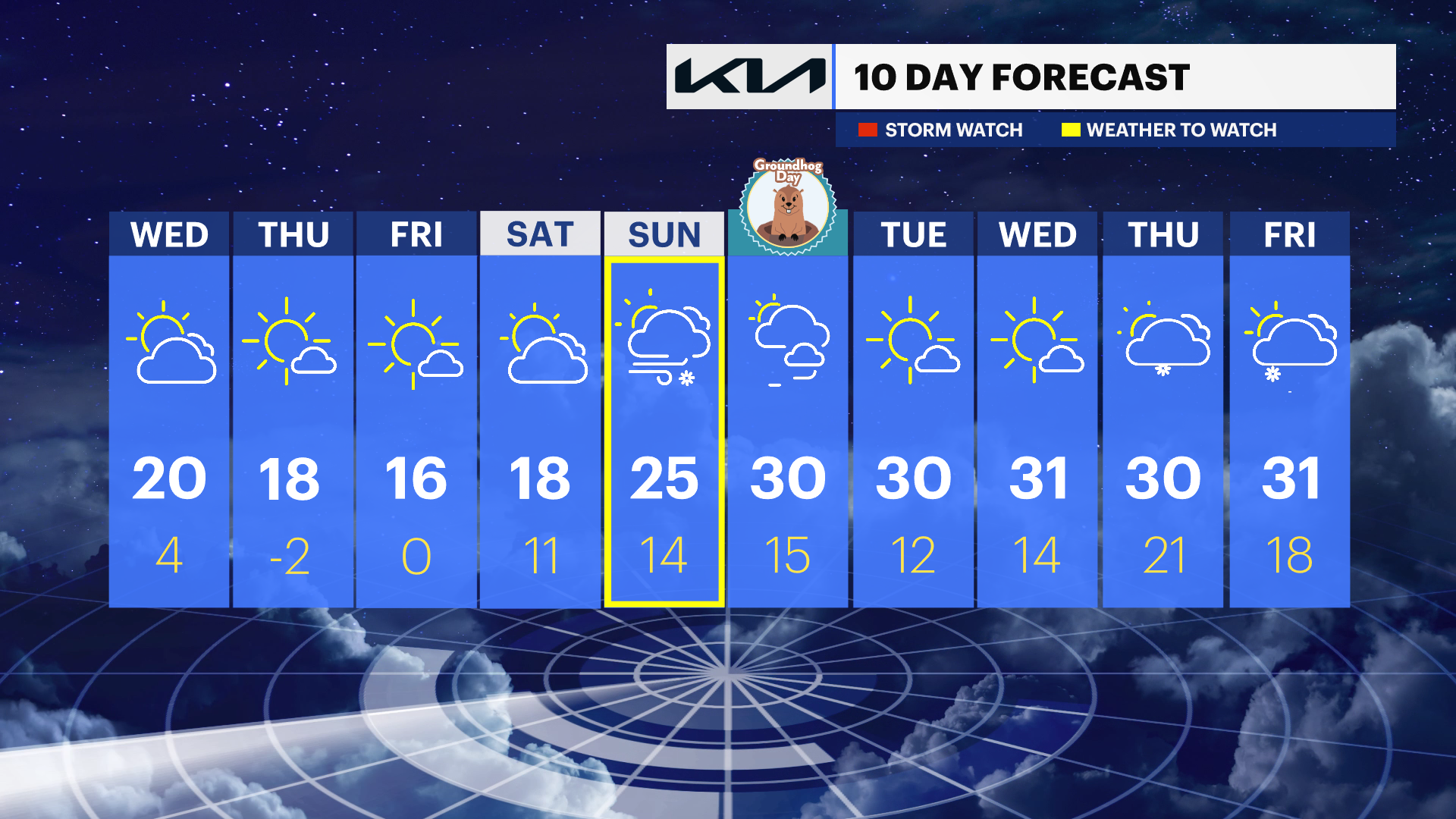 Sunday: Mostly cloudy, with a slight chance for snow showers. It will still be cold. High temperatures in the upper 20s. Low temperatures in the teens.