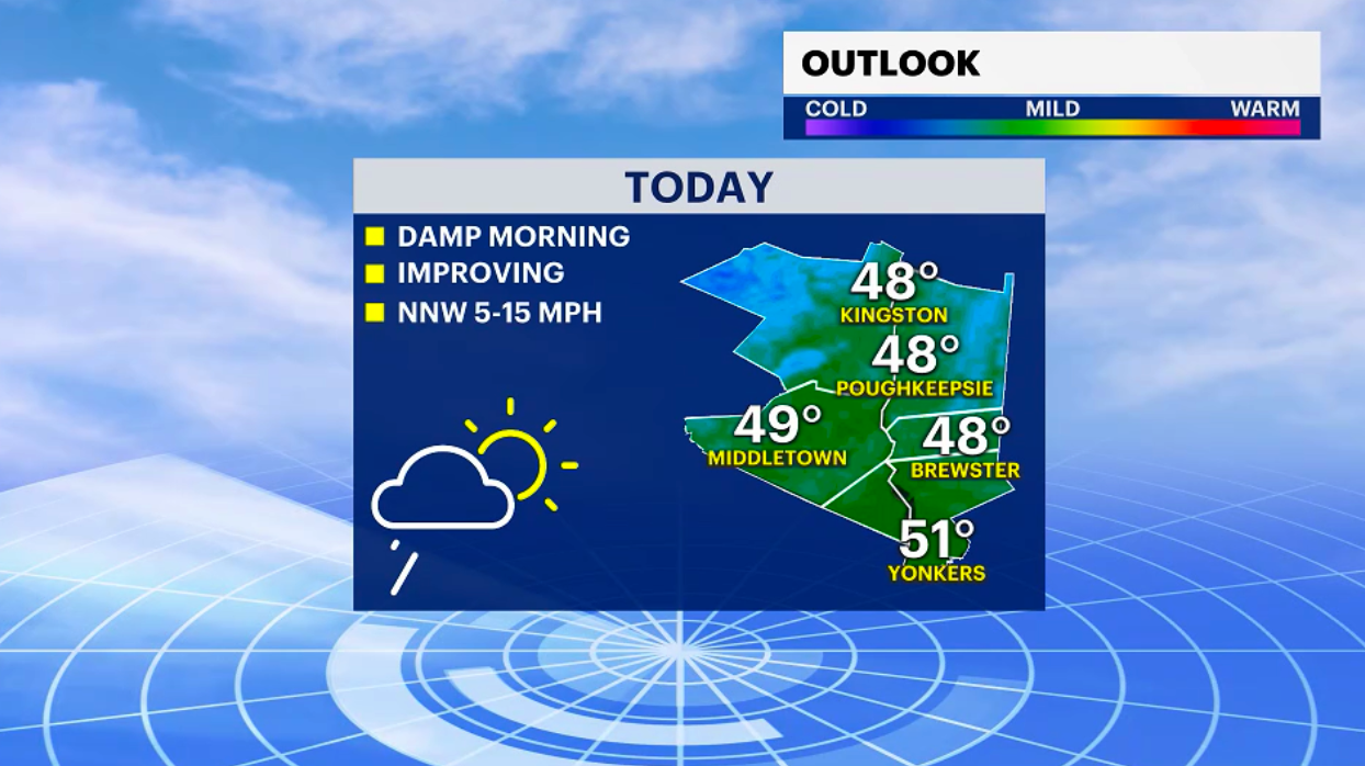 TODAY & TONIGHT: Damp morning, followed by a sunny, breezy afternoon. Rain totals nearly half an inch. Northerly winds get stronger filtering in a more "refreshing" feel. Highs near 50. Overnight lows near 29-31.