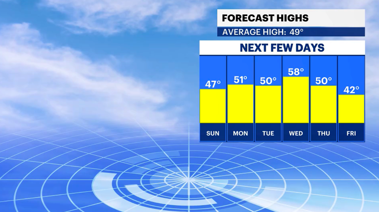 SUNDAY: Beautifully sunny and pleasant. Highs near 47. Overnight lows 36.