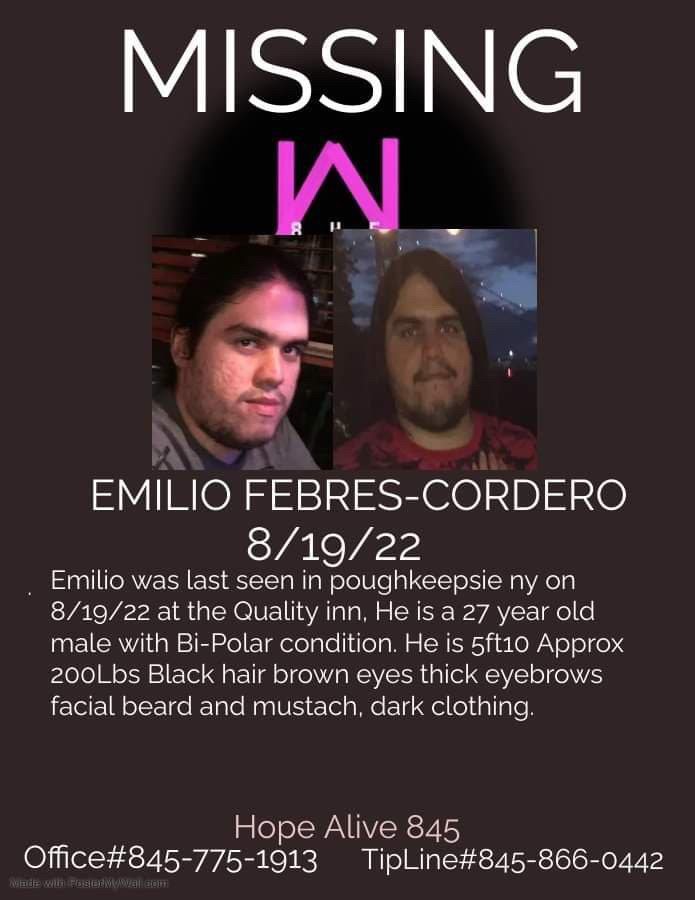 Emilio Febres-Codero, 27, was last seen wearing dark clothing on Aug. 19 at the Holiday Inn in Poughkeepsie.