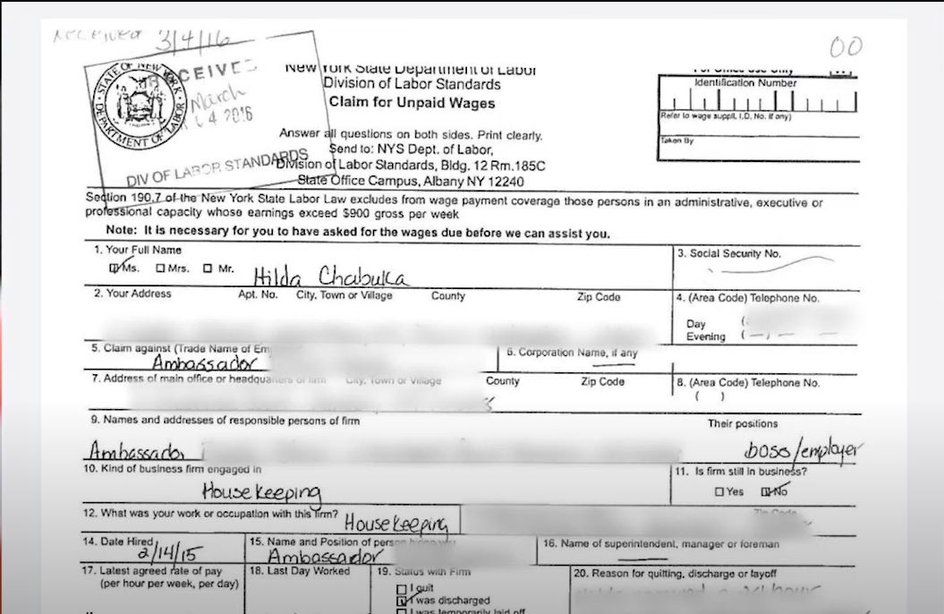 Hilda Chabuka says she was lured from her native Africa to New York after a prominent ambassador offered her a high-paying job as a cook at his mansion in Westchester - and was soon forced into a life of "modern-day slavery" working up to 19-hour shifts, seven days a week.