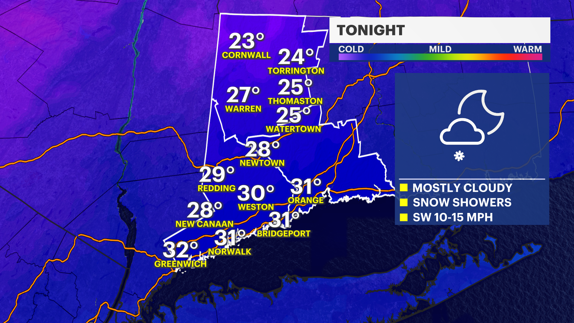 Temperatures tonight won't be as cold as they have been, but there are snow showers currently moving through our area. The showers won't amount to much, but there may be a coating of up to 1 inch of snow for Litchfield County.
