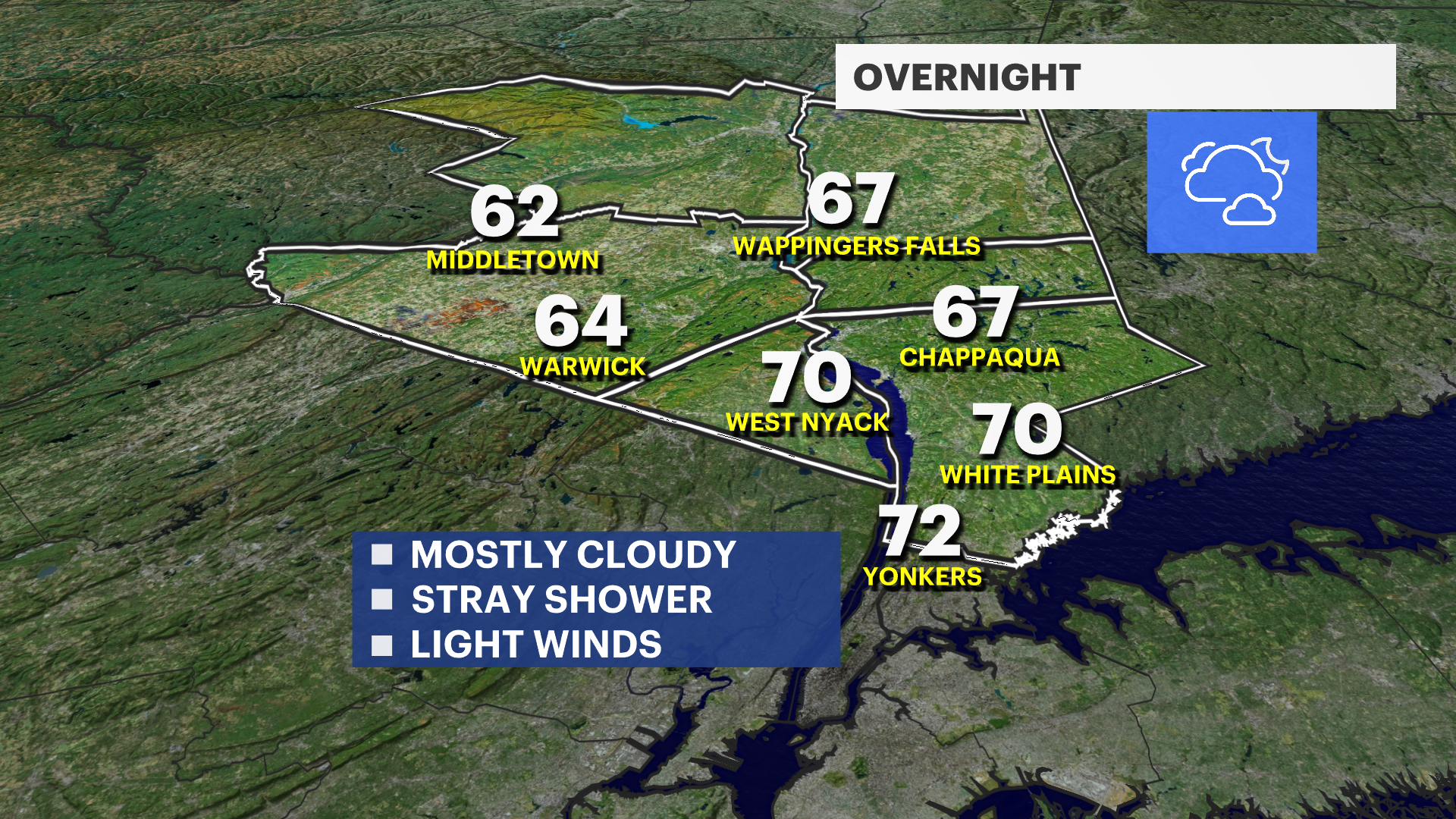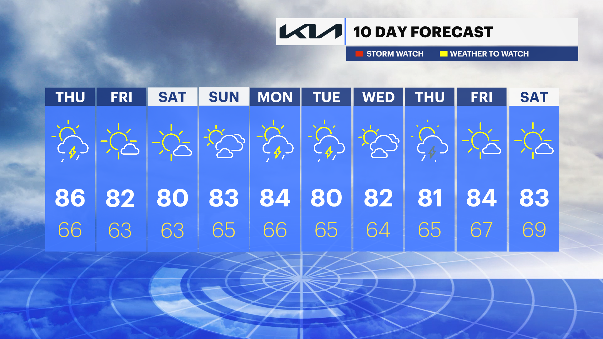 MONDAY: Mainly cloudy with showers possible. Highs around 84. Lows around 66.