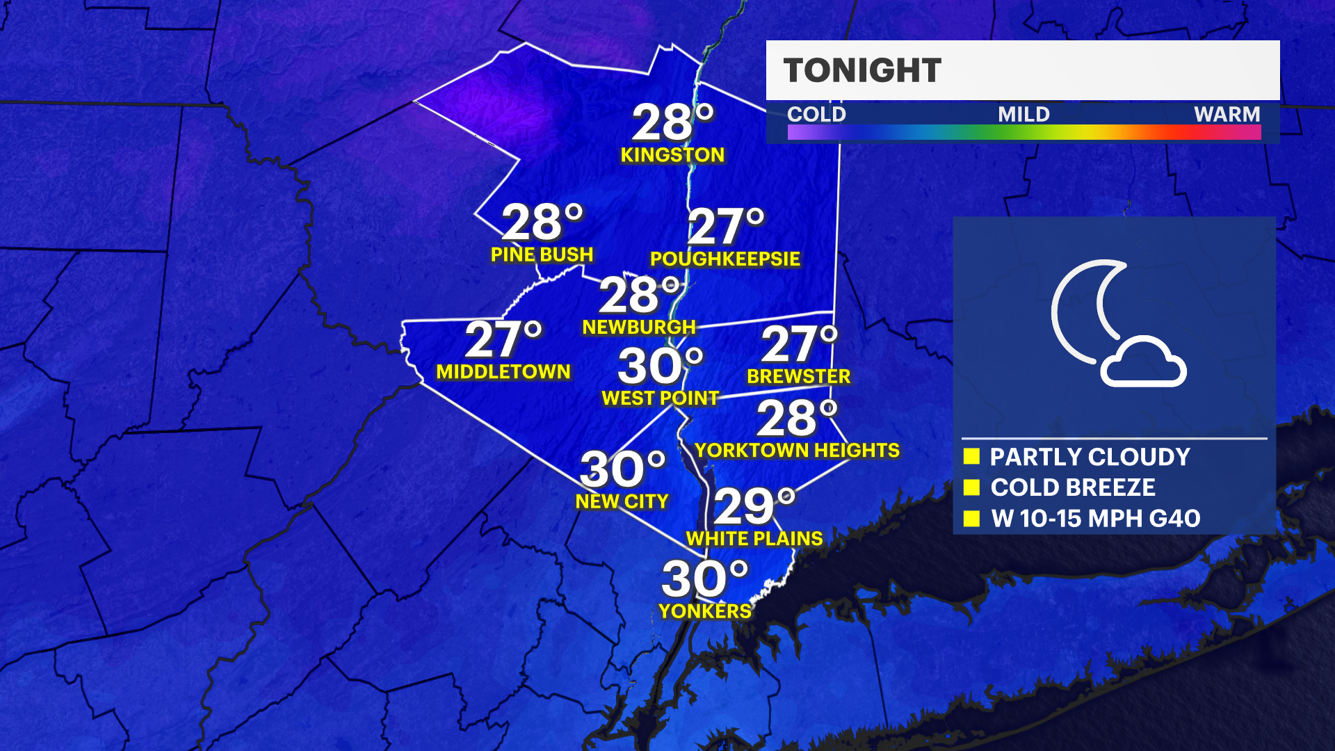 TONIGHT: Overall cold, breezy night with wind chill feels in the teens and 20s, under partly cloudy skies. Overnight lows near 27-30.