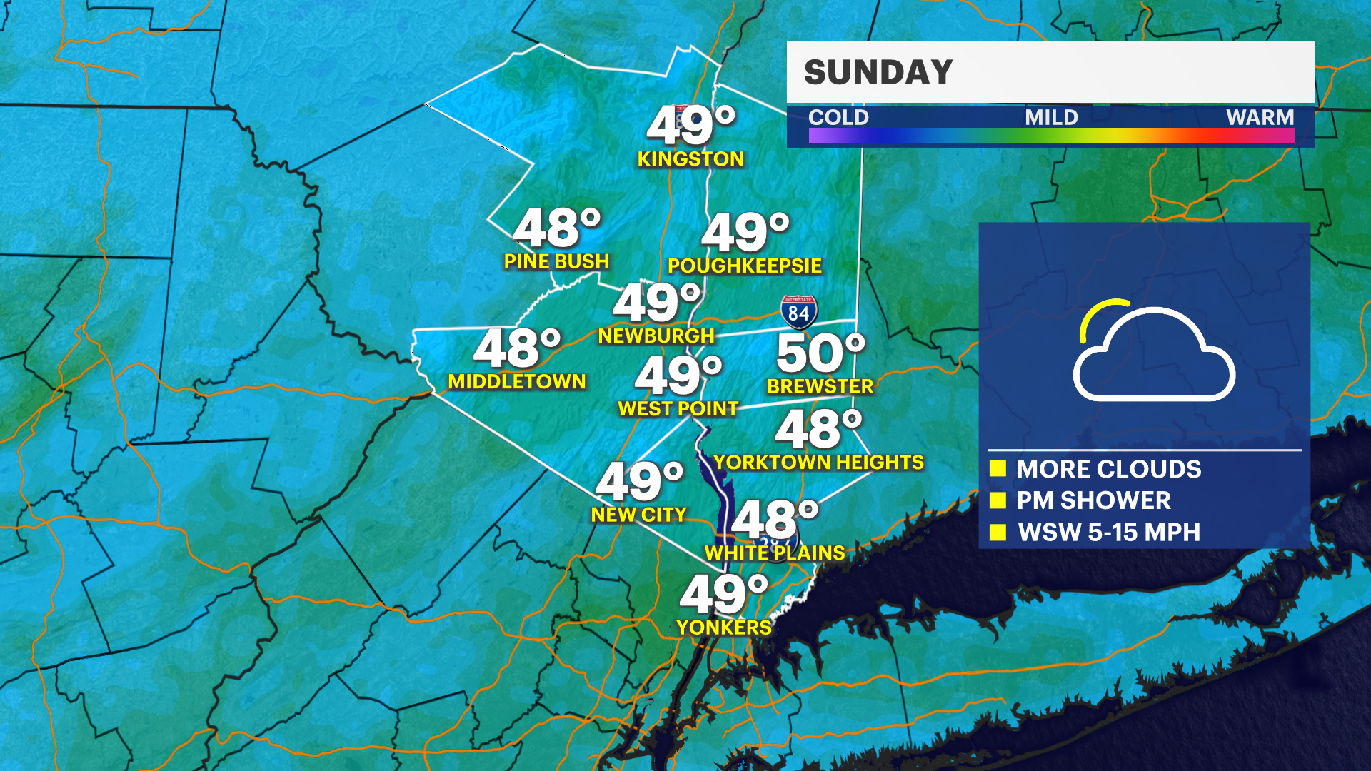 SUNDAY: Mostly cloudy to cloudy with rain shower chances in the evening. Highs in the mid-40s. Low in the mid-30s.