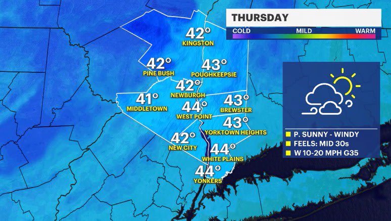Thursday (Thanksgiving): Mix of sun and clouds, windy. Highs: mid-40s. Lows: upper 20s to low 30s.