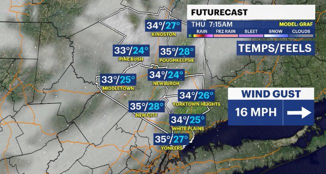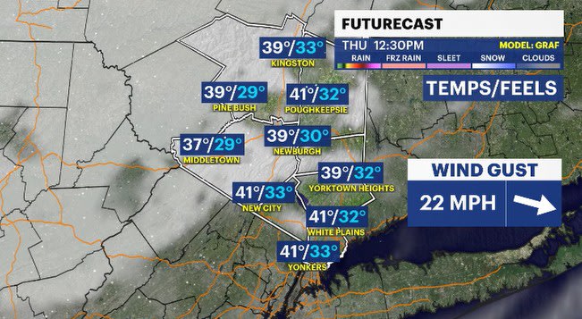 - Tonight: Colder air surges in with gusty winds. Lows: mid to upper 30s.