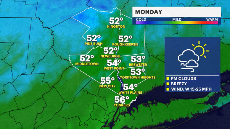 Highs reach the 50s on Monday ahead of a cold front moving through Monday evening.