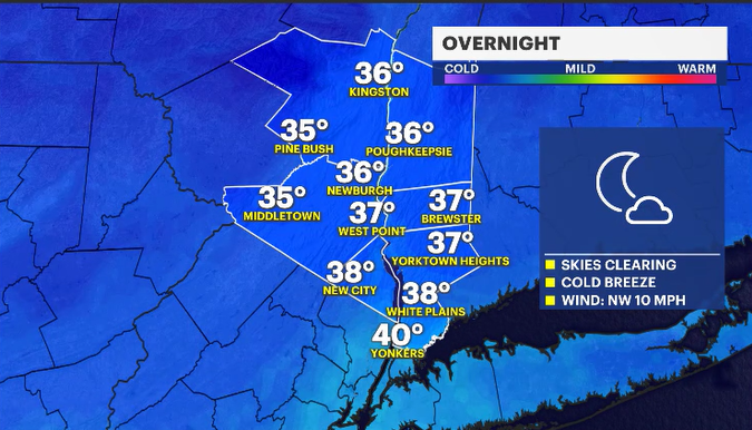 A brief round of rain showers is expected Monday evening. Across the Hudson Valley, especially north of I-84, a few snowflakes may mix in, but no accumulation is expected. Temperatures quickly fall into the 30s overnight.