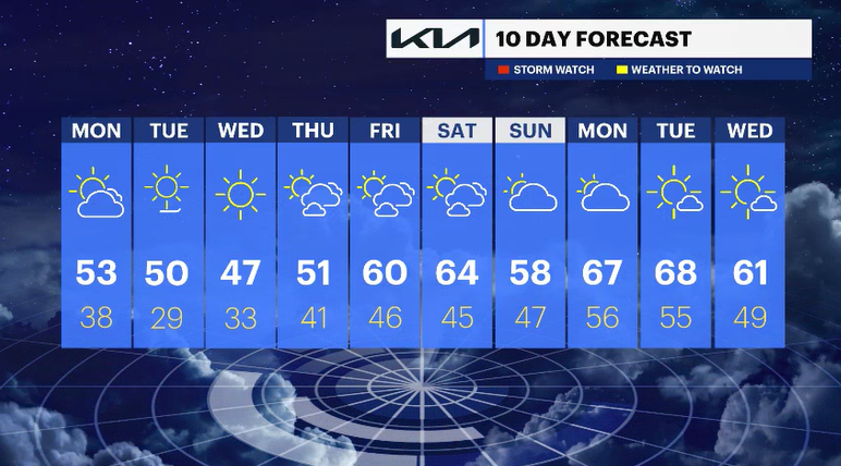 Tuesday and Wednesday turn colder despite mainly sunny skies. Highs stay near 50 degrees on Tuesday and only in the 40s on Wednesday. Widespread frost and even freezing temperatures are likely Tuesday night and Wednesday night.