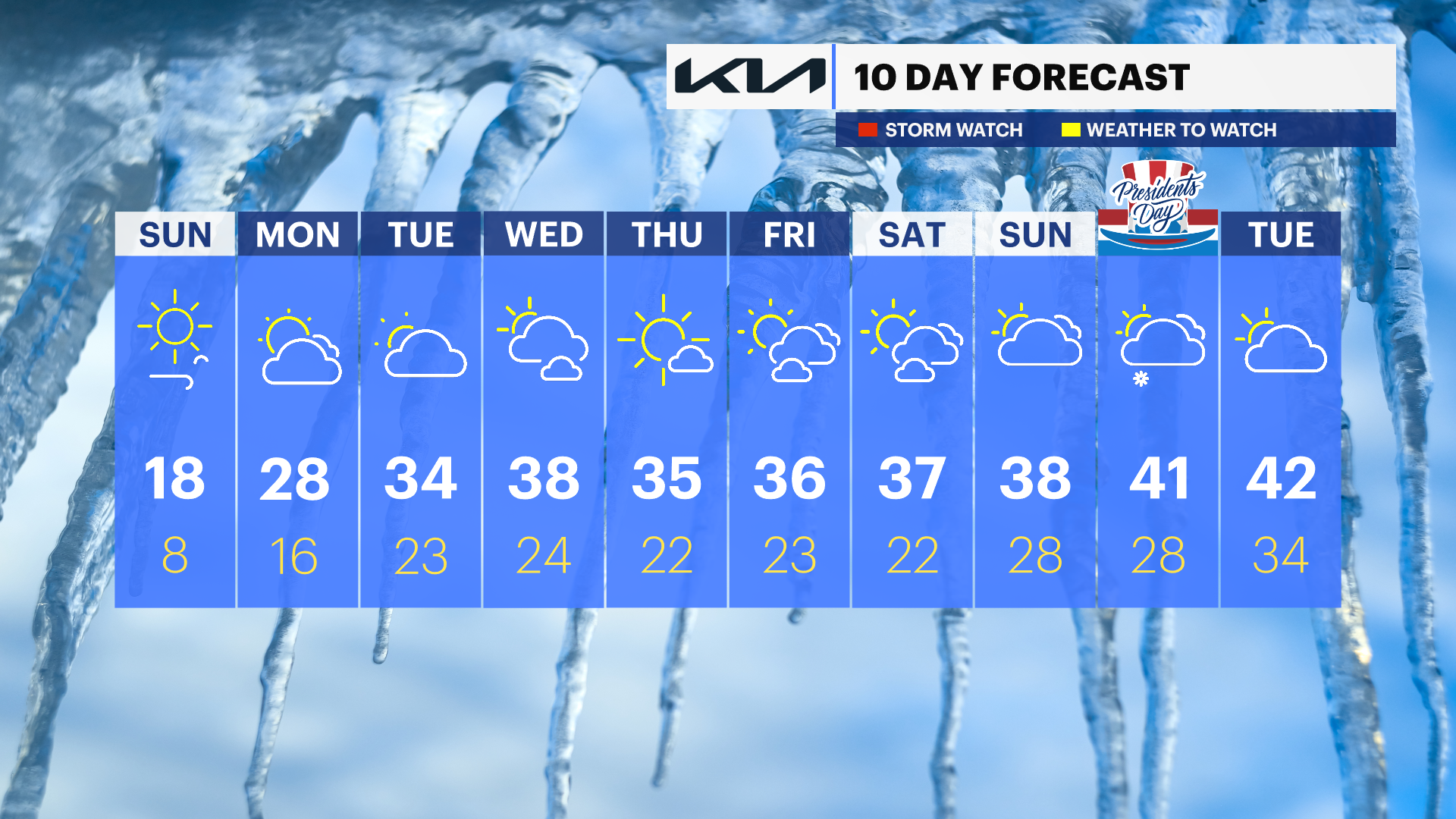Temperatures slowly moderate as we head into the new week, with clouds increasing Monday and readings edging back toward more seasonable levels. By midweek, highs climb closer to 40 degrees, signaling a noticeable break from the deep freeze, though it never turns truly warm.