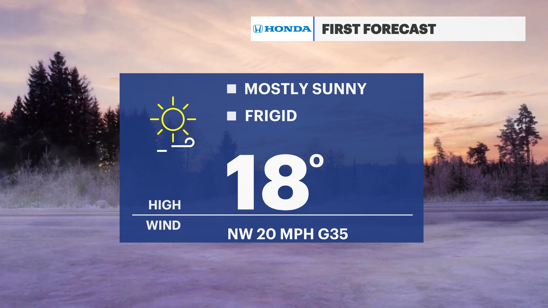 Sunday: Sunny but frigid and windy. Highs in the upper teens, with wind chills well below zero at times.