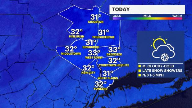 TODAY: Mostly cloudy with snow showers moving in for the evening rush and afterwards. Highs: upper 20s to low 30s.