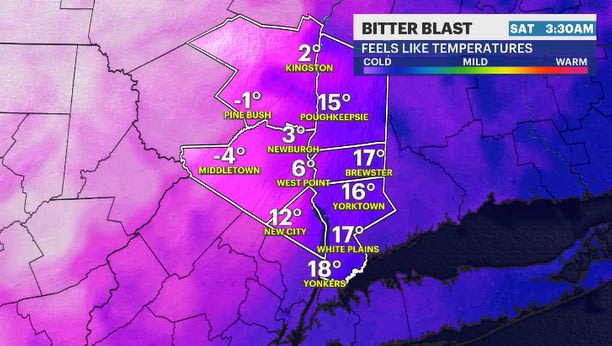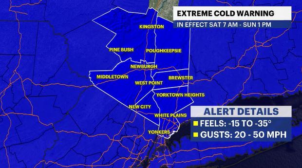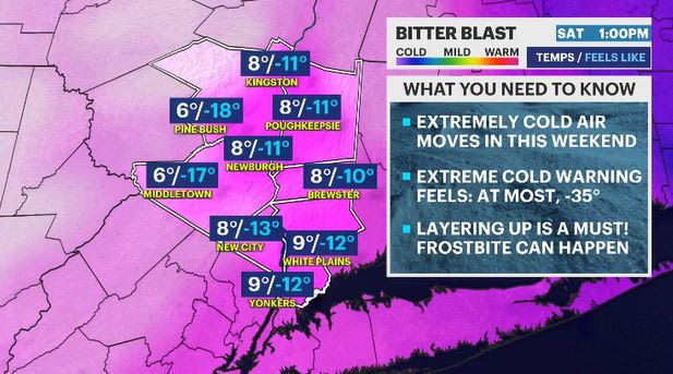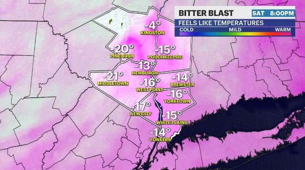 An Extreme Cold Warning has been issued for the entire Hudson Valley as some areas will experience their coldest temperatures of the season! Temps will feel between -15 to -35 for Saturday afternoon into Sunday morning. Gusty winds will be around nearly all weekend long and they will make the temps extremely cold. Gusts will be between 40-50 mph and a Wind Advisory is in effect for Saturday for around I-84 and southward. Frostbite WILL kick in quickly if you are not properly covered up and spending even a brief period of time outside.