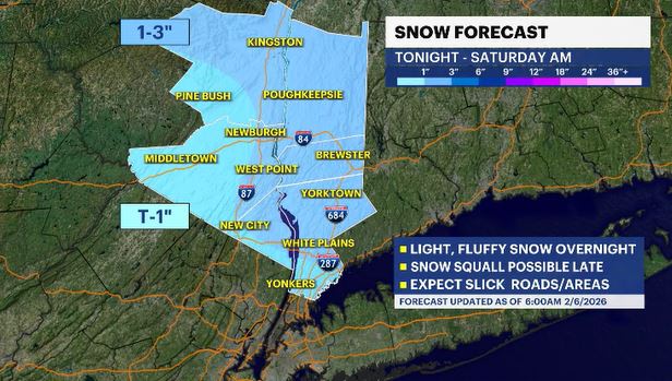 TONIGHT: Rounds of light snow with a quick burst possible overnight. A gusty wind moves in towards daybreak. Lows: upper single digits to upper teens.