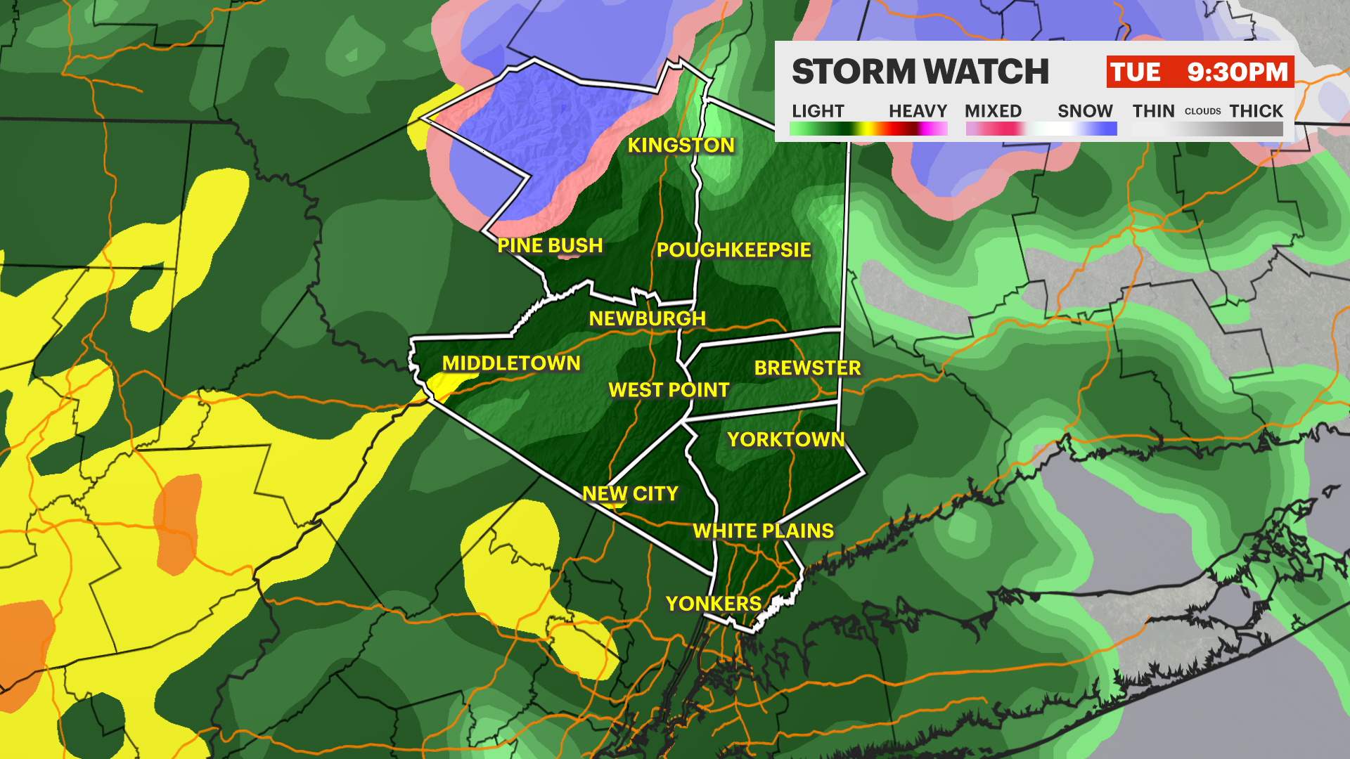 NEXT: STORM WATCH - Rain and gusty winds move in Tuesday afternoon through early Wednesday. Parts of Ulster County will see an initial period of wet snow!