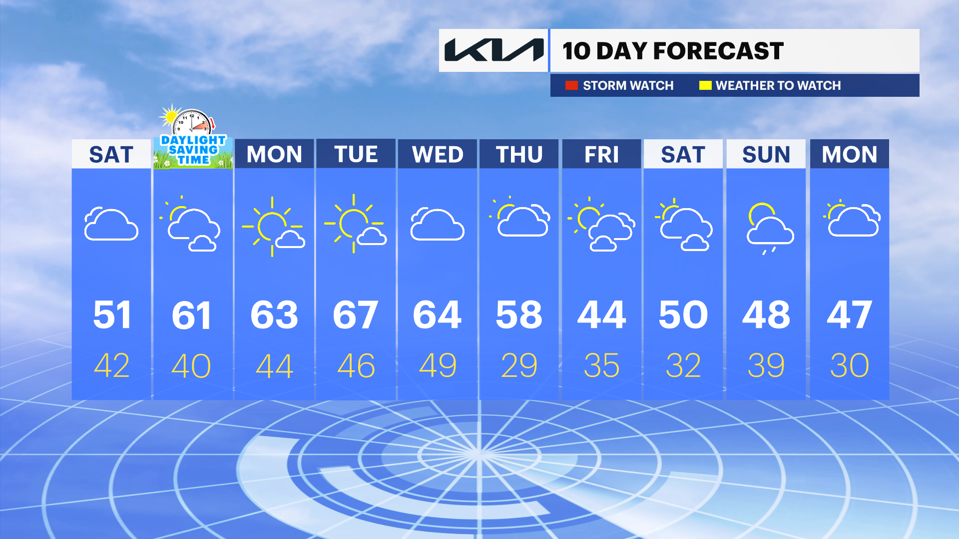 The real treat arrives Monday and Tuesday, that's when the sunshine returns! Warm temperatures are expected, with highs in the mid 60s. It will likely be our warmest strech of days since last November.