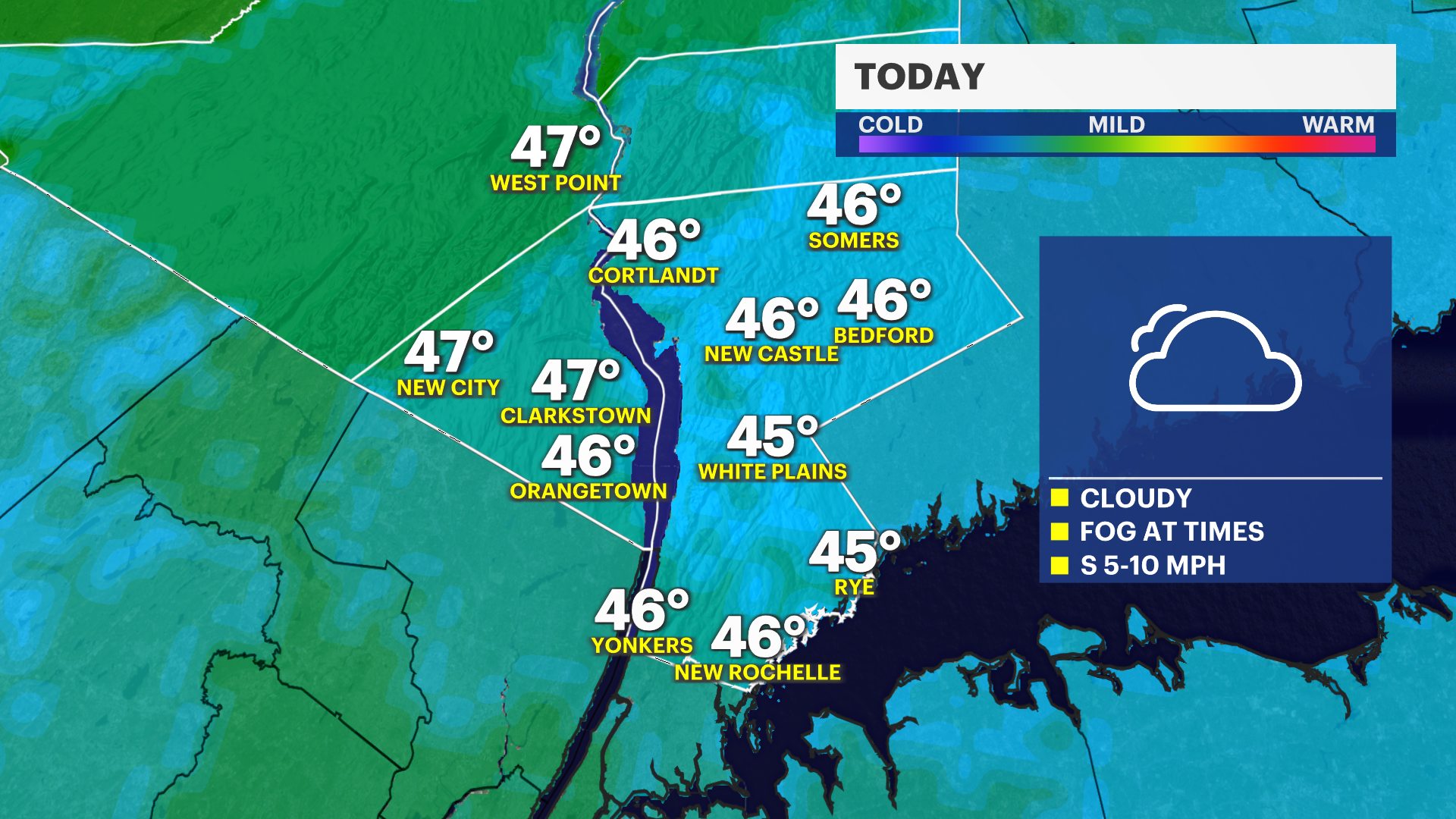 It's another gloomy, drizzly day with temperatures steady near 40-degrees. Dense fog continues through Sunday morning with a few showers after 10 PM.