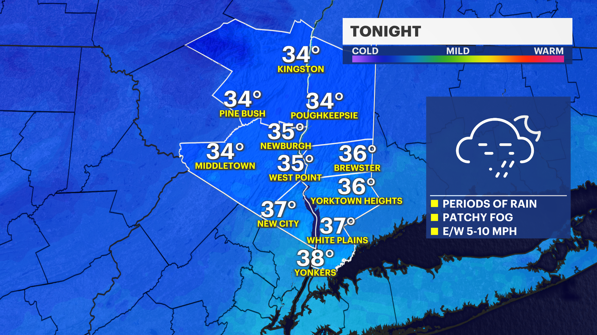 Rounds of rain are possible tonight into early Sunday morning. The rain may be heavy at times. Flooding is not likely, but we could see a few puddles. Patchy dense fog is also likely across the Hudson Valley overnight.