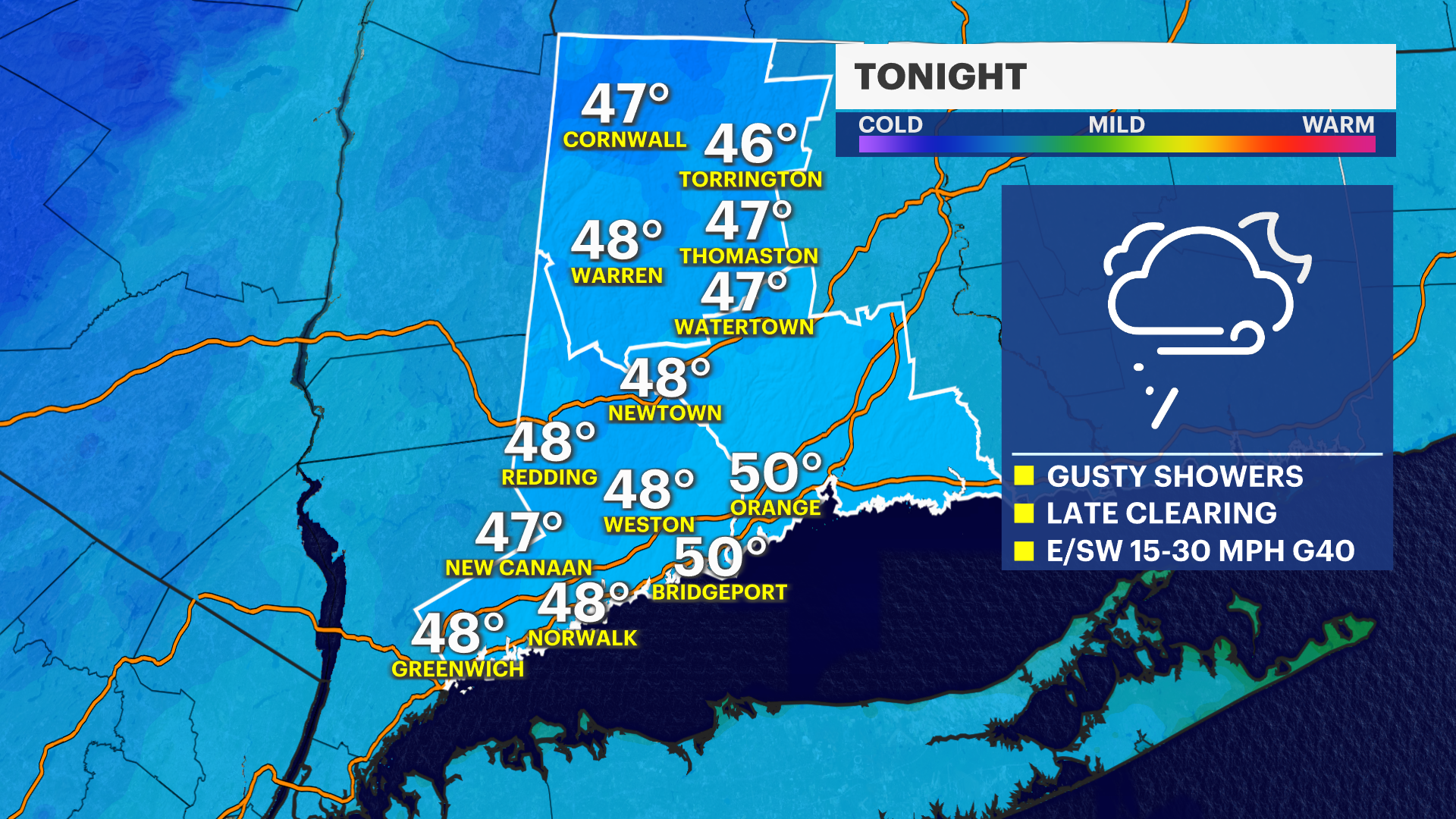 TONIGHT: Moderate to heavy gusty showers, late clearing. Low of 50.
